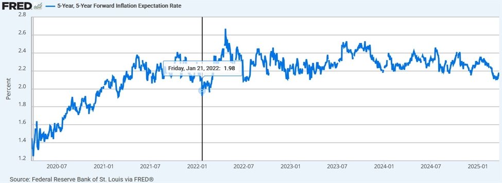 The thing is that market-based inflation expectations were a bit below 2% in January 2022 even when Core CPI in the US was at 6% during the same time. Below you can see the 5y5y forward inflation expectations which is the one Fed Chair Powell have been citing.