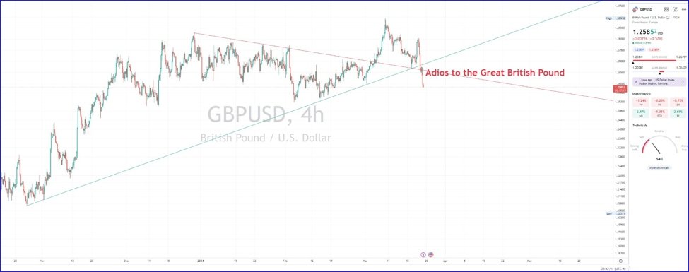 A Not-so-Great British Pound: The red arrow and the text “Adios to the Great British Pound” humorously illustrate the current situation, indicating a departure from stronger levels for the Pound. ?