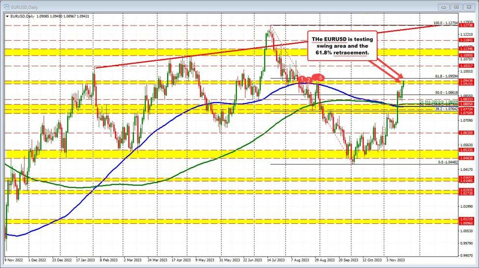 - The EURUSD is trading they are tied for the day and is testing the high of a swing area between 1.0925 and 1.0944. Above that, and traders will look toward the 61.8% retracement of the move down from the July high. That level comes in at 1.09594.