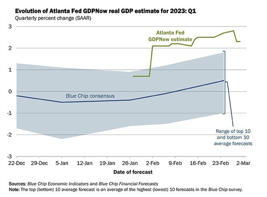 <p>The Atlanta Fed GDPNow estimate for 1Q growth has dipped to 2.3% from 2.8% previously. In their own words:</p><blockquote>The GDPNow model estimate for real <a href="https://www.forexlive.com/terms/g/gdp/" class="terms__main-term" id="22438661-6aff-4854-bfc8-fcc2084a48f0" target="_blank">GDP</a> growth (seasonally adjusted annual rate) in the first quarter of 2023 is 2.3 percent on March 1, down from 2.8 percent on February 27. After recent releases from the US Census Bureau and the Institute for Supply Management, the nowcasts of first-quarter real gross private domestic investment growth and first-quarter real government spending growth decreased from -5.1 percent and 2.0 percent, respectively, to -6.1 percent and 1.5 percent, respectively, while the nowcast of the contribution of the change in real net exports to first-quarter real GDP growth decreased from 0.82 percentage points to 0.60 percentage points.</blockquote><p>The next release will be on March 7</p>