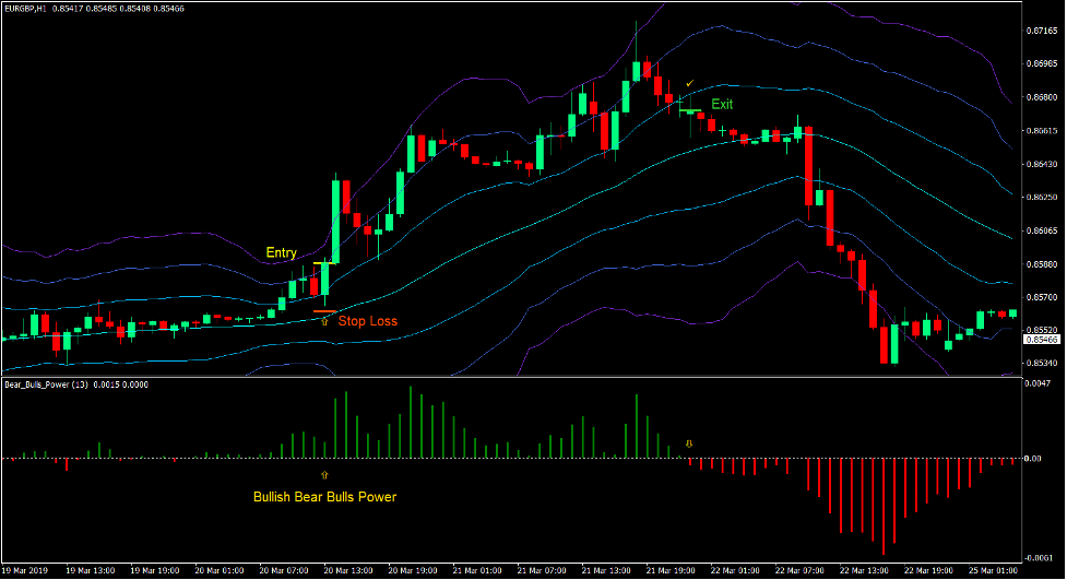 The Bear Bulls Power indicator is then used to confirm the direction of the market sentiment. This is identified based on whether the histogram bars are positive or negative.