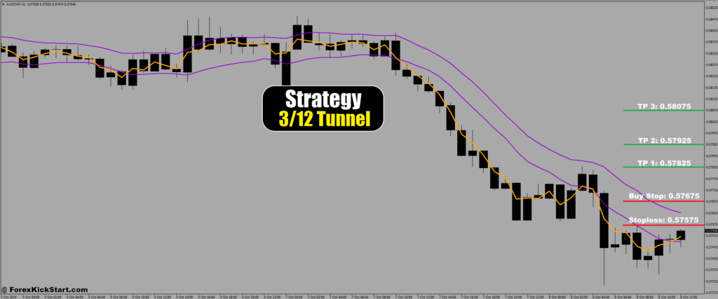 Currently, the 3/12 Tunnel strategy has identified a trading opportunity on the AUD/CHF pair within the H1 timeframe. I’ve shared a trade setup image for your reference. The details of the trade are as follows: