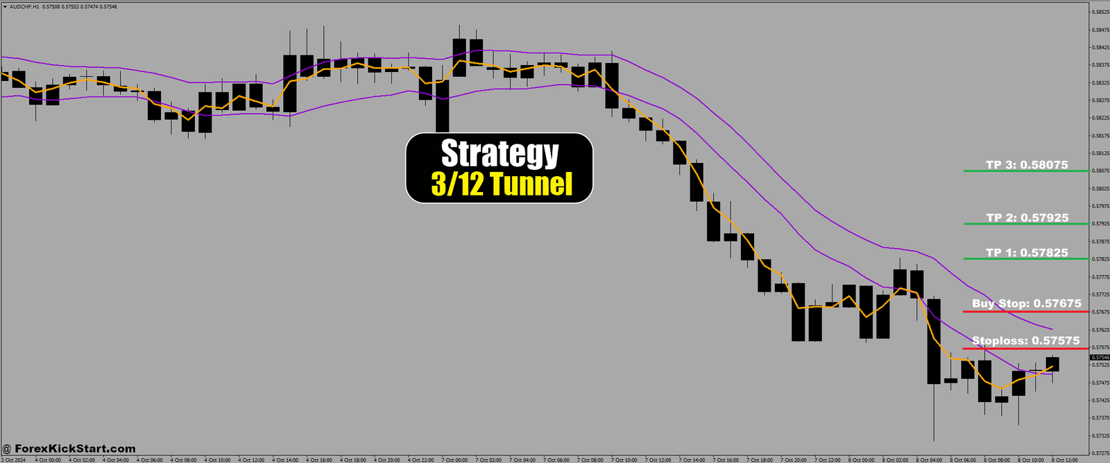 Currently, the 3/12 Tunnel strategy has identified a trading opportunity on the AUD/CHF pair within the H1 timeframe. I’ve shared a trade setup image for your reference. The details of the trade are as follows: