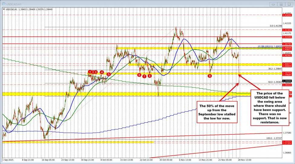 Meanwhile, the USDCAD is slicing through the swing area where I expected some short-term buying between 1.3968 and 1.3975. The low price as extended to 1.3939. The price is testing the 50% midpoint of the move up from the September swing low. That level comes in at 1.39367.