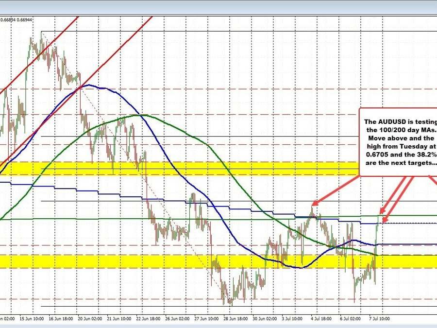 The US jobs data sent the price higher, but resistance stalled the rally ahead of the 100-hour moving average (currently add 0.66632). After a correction lower, the price started to run back to the upside breaking above both the 200 and 100-hour moving average in the process. The move has now extended to the aforementioned daily moving average targets.