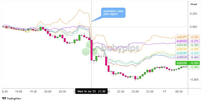 The Australian dollar, which had been consolidating against most of its peers prior to the release, experienced immediate and substantial selling pressure following the release, with the currency declining across the board.