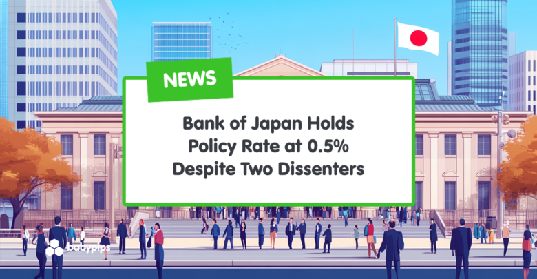 The Policy Board voted 7-2 to maintain the uncollateralized overnight call rate at around 0.5 percent, with board members Takata Hajime and Tamura Naoki dissenting in favor of raising rates to 0.75%. In explaining their dissent, Takata argued that Japan had shifted away from a deflationary norm and largely achieved the price stability target, while Tamura noted that upside risks to prices warranted bringing policy closer to neutral.