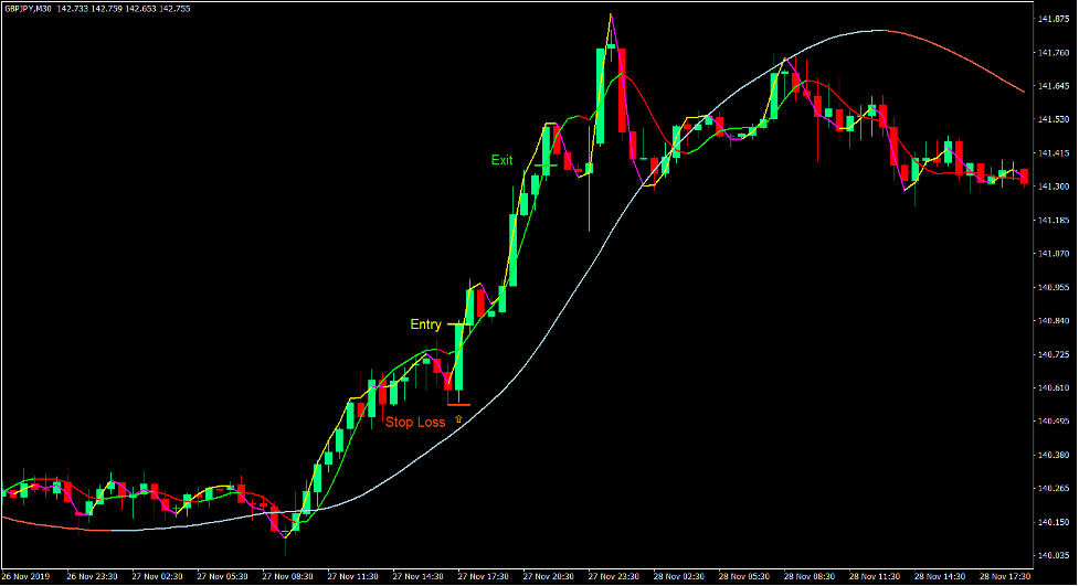 The trade signals will then be generated based on the crossing over of the Signal Line and the Execute Line. The color of the lines should also agree with the direction of the crossover. This would allow us to align the immediate short-term momentum, short-term trend, and the long-term trend.