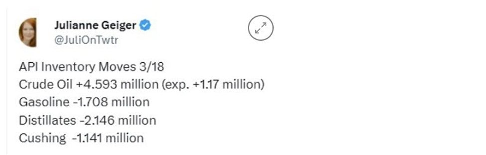 - Crude oil is trading near unchanged at $66.75 after falling yesterday on peace hopes in Russia/Ukraine. Today the the cease-fire agreement of energy and infrastructure seems already to have been broken. Ukraine’s Zelenskyy is expected to speak to Pres. Trump. The oil inventory data will be released later today. Thr private data released late yesterday showed: