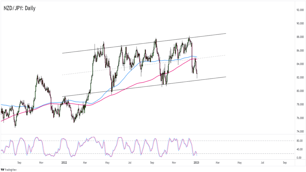 See, the pair is about to hit the 82.00 psychological handle that lines up with a channel support that’s been holding since mid-2022.