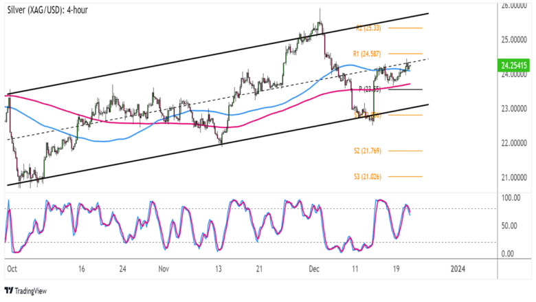 However, Stochastic is starting to turn south after hitting the overbought zone, suggesting a potential return in bearish vibes. In that case, silver could make another dip to the channel bottom near S1 ($22.80).
