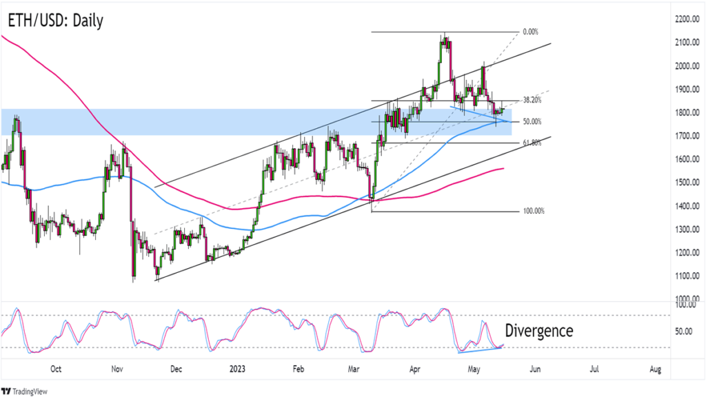 Not only that, but $1,800 is also pretty close to the daily chart’s 100 SMA as well as the 50% Fibonacci retracement of March and April’s upswing.