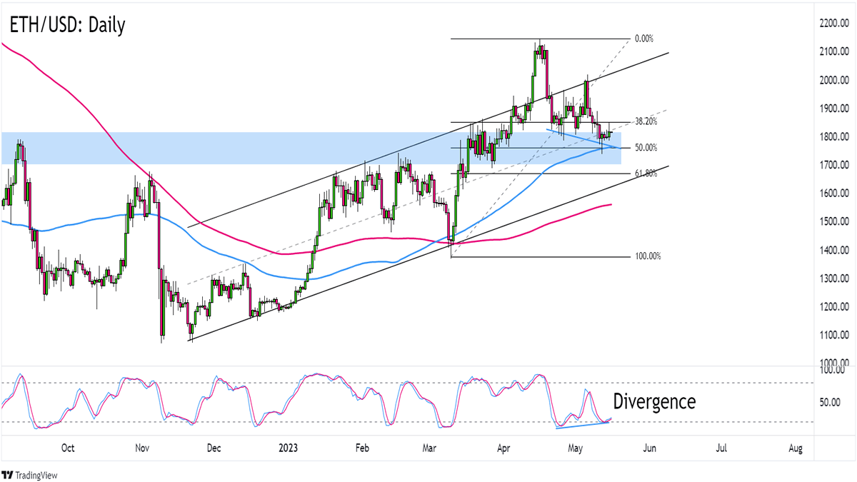 The pair even jumped above its ascending channel pattern in April and reached the $2,140 area before settling back down to its $1,800 levels.