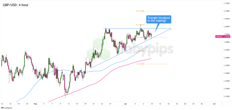 The rising trend line support remains intact for now, aligning with the 1.3529 Pivot Point.
