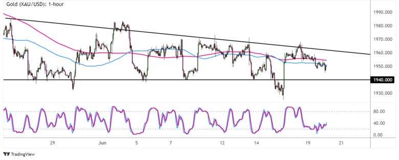 On its hourly time frame, XAU/USD is still stuck inside a descending triangle formation with its lower highs and support around $1,940.