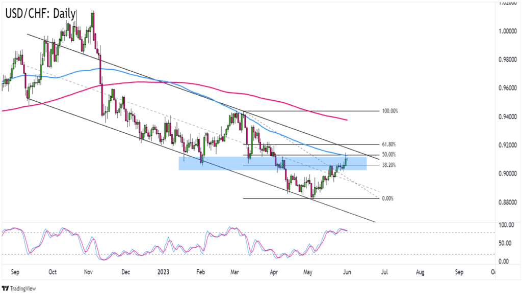 What makes the setup interesting today is that USD/CHF is knocking at the 50% Fibonacci retracement of March and April’s downswing.