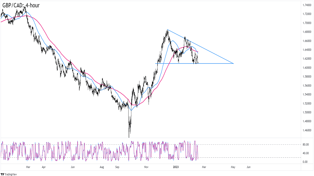 First up is GBP/CAD consolidating inside a descending triangle on the 4-hour time frame.