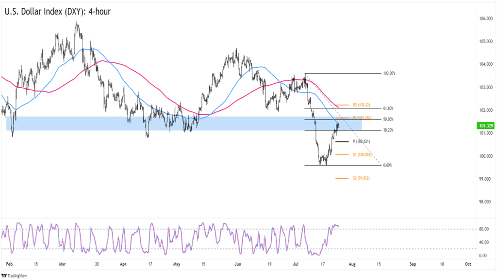 Not only that, but the dollar’s current levels are also not far from the 50% Fibonacci retracement of July’s downswing AND the R1 (101.65) Pivot Point level on the chart.