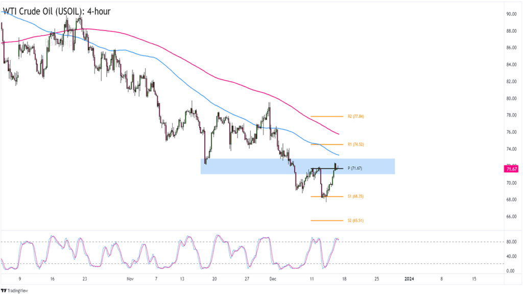 WTI crude oil (USOIL) found support from the S1 ($68.35) Pivot Point line and is now trading closer to the actual Pivot Point line ($71.67).