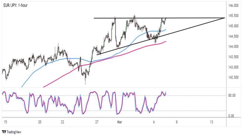On the other hand, Stochastic is reflecting overbought conditions, so the oscillator heading south could take the pair back down to the triangle support near 144.50.
