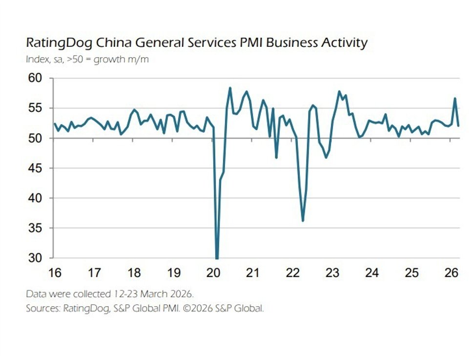 The RatingDog China General Services PMI came in at 52.1, down from February’s 33-month high of 56.7, signalling a slower but still solid expansion in activity. The sector has now remained in growth territory for over three years, reflecting a sustained recovery trend.