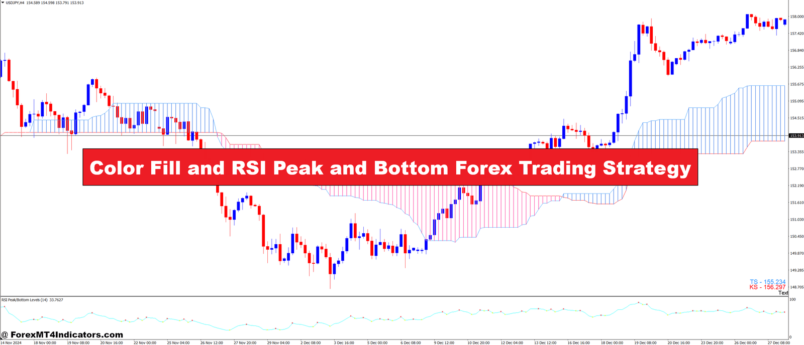 The Color Fill and RSI Peak and Bottom Forex Trading Strategy is a great tool for forex trading success. It uses the Relative Strength Index (RSI) and color fills to help spot market changes. RSI above 70 means the market might be overbought. RSI below 30 suggests it might be oversold.