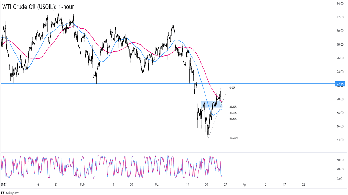 This time, $70 also lines up with the 38.2% Fibonacci retracement of this week’s downswing as well as the broken 200 SMA resistance on the 1-hour time frame.