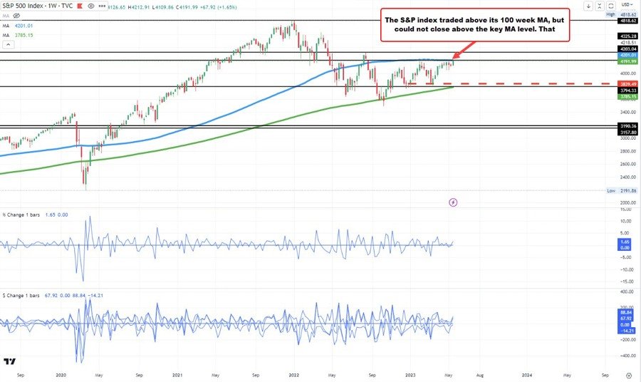 Technically, however, the S&P index could not close above the 4200 natural level (it is closing at 4191.99), nor could the price of the S&P close above its 100-week moving average at 4201.1. Close but no cigar. That could be problematic from a technical perspective. It will take a move above the 100-week moving average next week to give the buyers more ammunition for further upside probing. Absent that and we could be in store for a corrective week.
