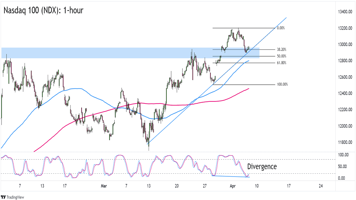 And then there’s the bullish divergence on the 1-hour time frame which could help push NDX back to its previous highs.