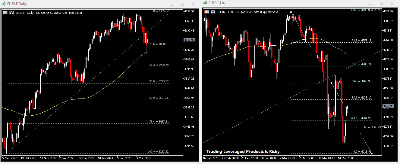 EU50.F pulled back after encountering resistance at 4326 last week . The index is now closing above 4068 (FR 23.6% stretched from October 2022 lows to March this year highs) support and 100-day SMA following positive news from the government on Credit Suisse’s liquidity provision. In addition, the 4-hour chart shows short-term support at 4088. Should the share price break below these two levels, the selling momentum could extend further to 4014. Short-term resistance is seen at 4133. A break above this level will bring the bulls to test 4170 and then 4205.