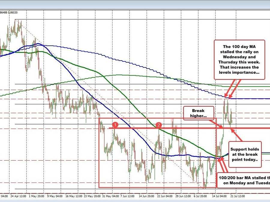 Looking at the 4-hour chart below, the pair on Monday and Tuesday based at the 100/200 MA. The basing at the level, gave the buyers the go ahead to push higher. On Wednesday and Thursday, the price raced higher but found resistance sellers against the 100 day MA at 0.8701. The highs got within a couple pips of those highs this week.