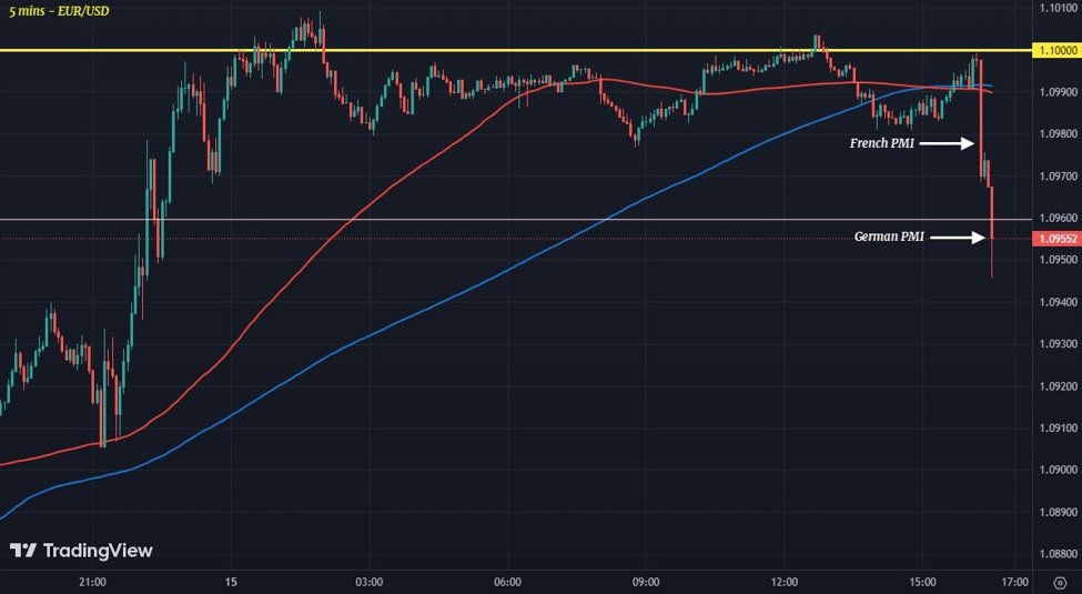 EUR/USD is slipping further to 1.0950 levels from around 1.0970 earlier after the French PMI data, as the German PMI data here confirms a recession in Europe to end the year. The pair does have some large option expiries at 1.0950, so that could limit losses in the session ahead before the expiries roll off.