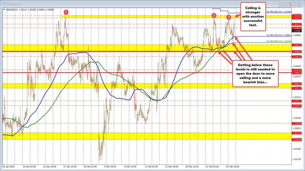 The EURUSD tested the ceiling target between 1.0527 and 1.05325, just below the 100-day moving average at 1.05382. The high for the day reached 1.0528, where sellers stepped in, accelerating momentum after President Trump announced plans to impose a 25% tariff on EU autos and “other things” in April.