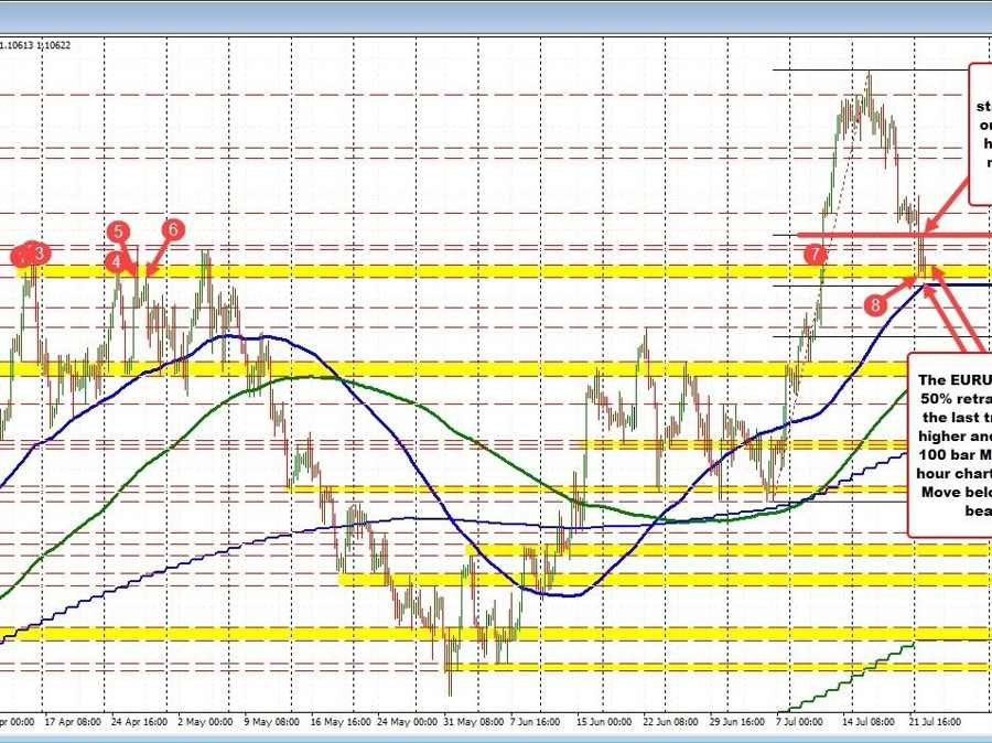 The EURUSD is trading to a new set as low as the day comes toward a close. In the process, the price has dipped below the swing area between 1.1062 and 1.1075 bread see red numbered circles on the chart above.