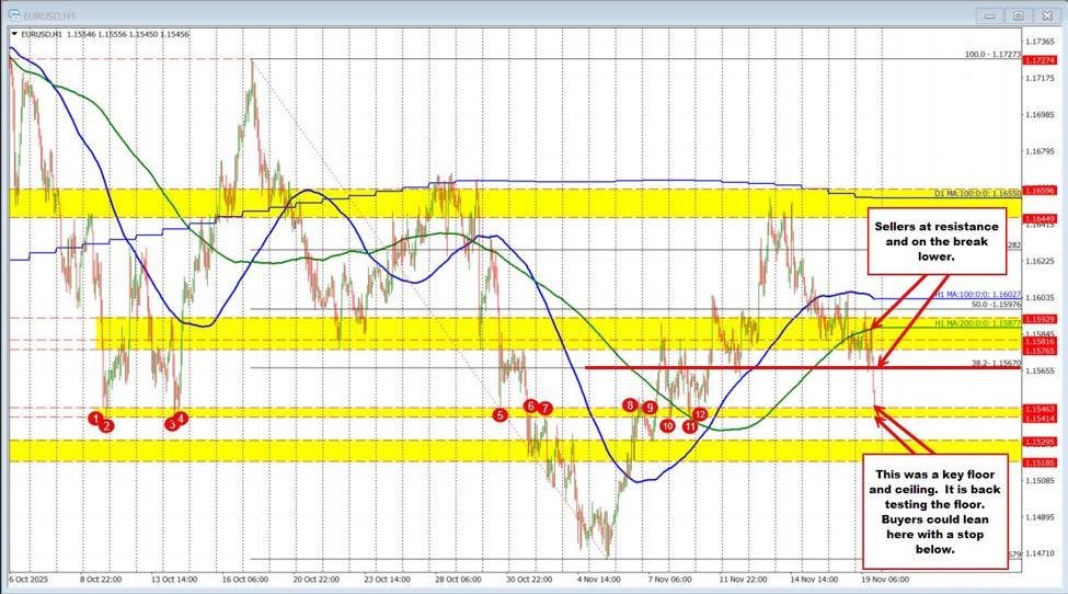 The EURUSD has fallen sharply after testing key resistance in the early U.S. session, where sellers stepped in decisively. As outlined in today’s Kickstart video, that resistance area capped the upside and sparked a reversal. The decline has now pushed the pair below the 38.2% retracement of the move up from the mid-October low at 1.15670, sending price down toward a critical swing area that acted as a floor in October, a ceiling in early November, and a floor again after the breakout on November 7. The last successful test of that floor on November 11 helped launch the rally toward last week’s high at 1.1651.