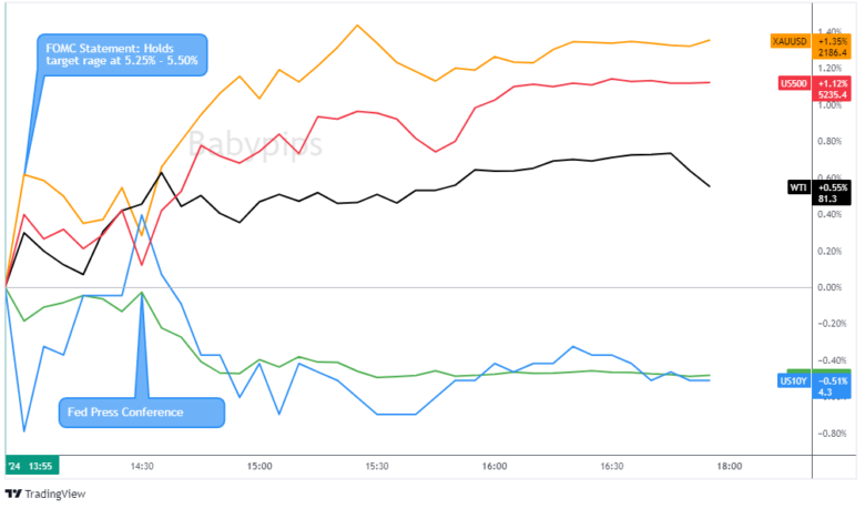 The Federal Reserve Open Market Committee gave their latest monetary policy statement today, holding the target range at 5.25% to 5.5%, as widely expected.
