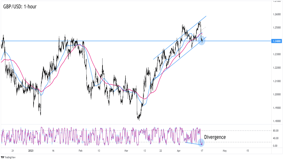 Coincidentally, 1.2400 also marks the bottom of the channel on the 1-hour time frame.