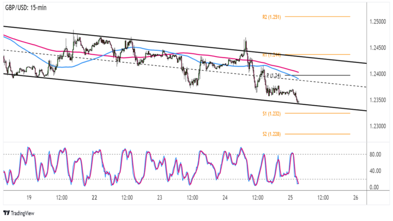 If the channel support holds as a floor, GBP/USD could recover to the channel top that lines up with R1 (1.2440) or at least until the mid-channel area of interest that coincides with the pivot point (1.2400).