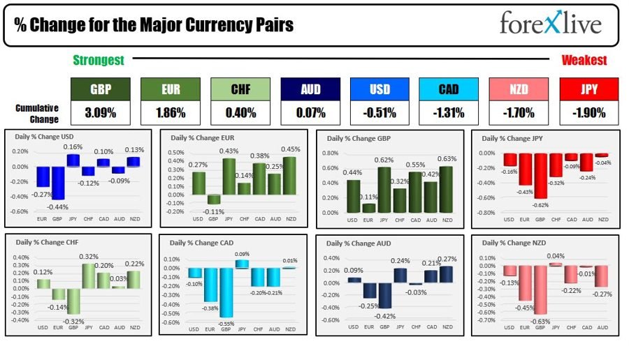 Below is a ranking of the strongest to the weakest. The cumulative changes of the USD vs the majors is negative on the day and near the middle of the majors.