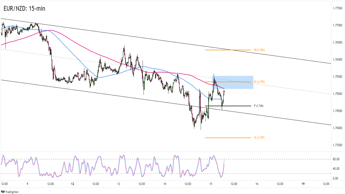 EUR/NZD could spike to 1.7550 – 1.7560 during the ECB event before revisiting its previous lows near 1.7450.
