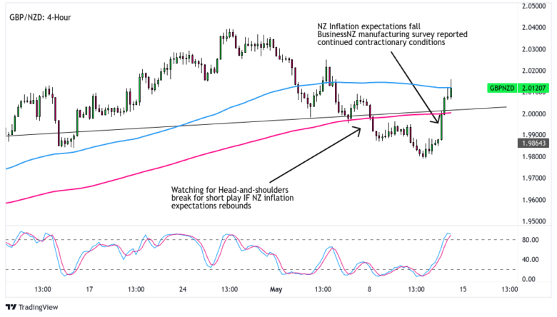 We discussed the potential of a round of pound weakness against the Kiwi on Monday, particularly if New Zealand prints a rebound in inflation expectations. We also noted a chart setup that may draw in technical sellers, a head and shoulders pattern, suggesting a possible reversal on the four hour time frame.