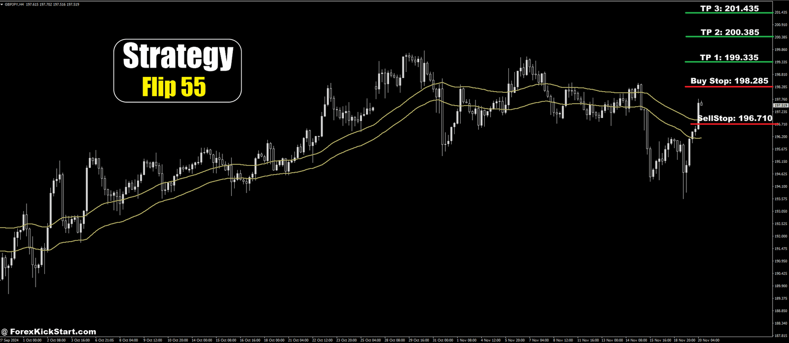 Currently, the Flip 55 strategy has identified a trading opportunity on the GBP/JPY pair within the H4 timeframe. I’ve shared a trade setup image for your reference. The details of the trade are as follows: