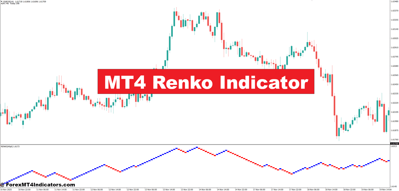 The MT4 Renko Indicator is a custom tool for MetaTrader 4 that builds Renko charts based on price movement rather than time. Each “brick” forms only after price moves a set number of pips. Time doesn’t matter. A brick can take five seconds or five hours to form.
