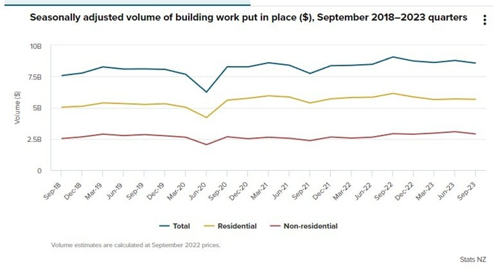 Data from Stats NZ shows that the seasonally adjusted volume of building activity in New Zealand was $8.6 billion in the September 2023 quarter. This is down 2.4% on the quarter: