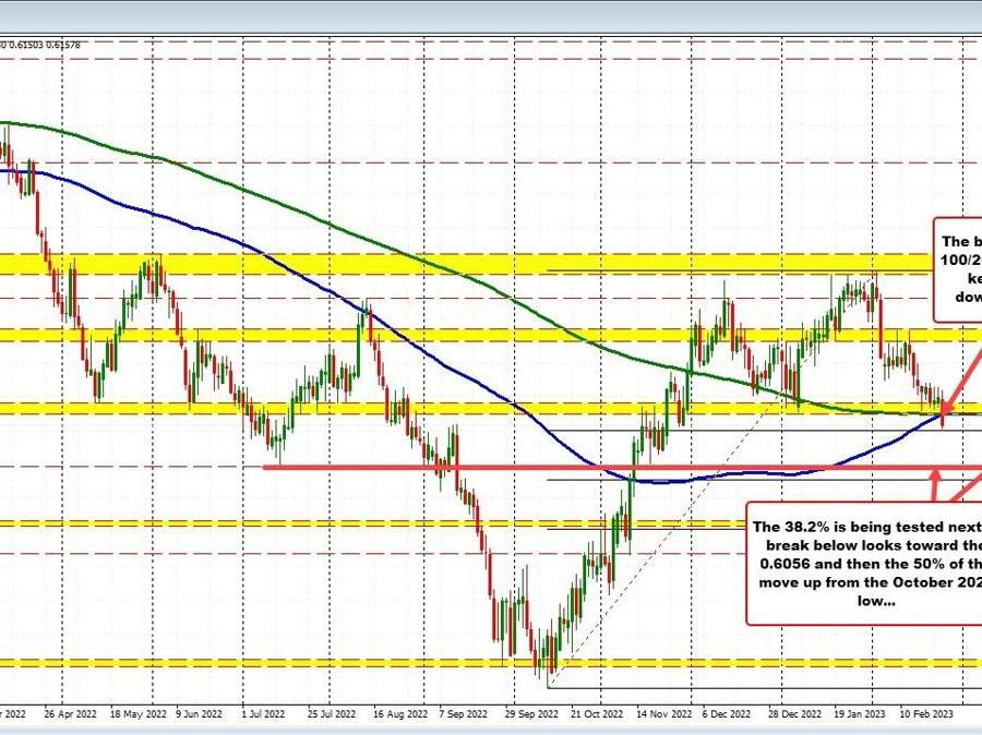 Looking at the daily chart below, the price is approaching the 38.2% of the move up from the October 2022 low. That level comes in at 0.61453 (the low reached 0.61503 so far). A move below that retracement would open the door for a move toward 0.6056 over times.