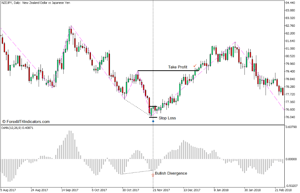- Compare the swing lows with the dips of the OsMA bars and note if there is valid bullish divergence.