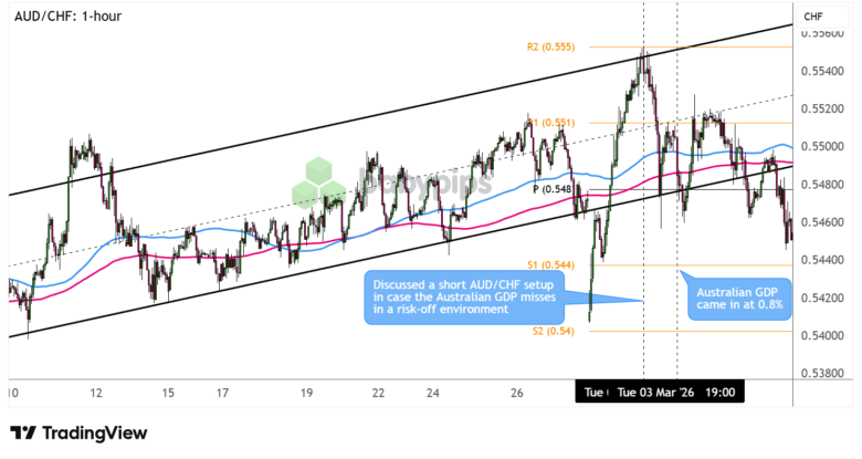 Overall, we’d rate this week’s watchlist discussions and reassessment as “likely” supportive of a potential positive outcome for those who leaned bearish right away on AUD/CHF after the reassessment, given that the Australian dollar had a bearish reaction to the weak GDP components and prevailing risk-off lean from geopolitical events. AUD barely gained any traction on brief risk rallies midweek, resuming its bearish trajectory as the US-Iran war extended one day after another, hardly recovering past pre-event levels as the week progressed.