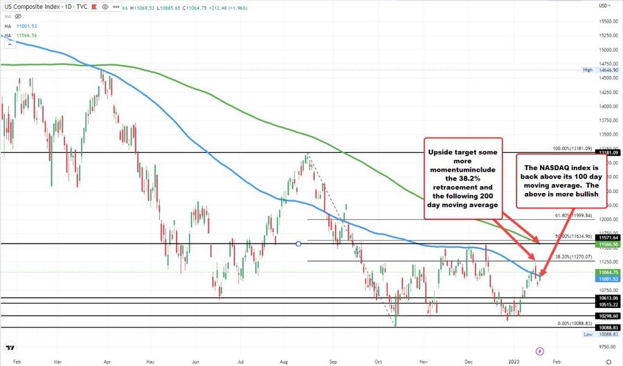 <p>The major stock indices are moving higher led by the NASDAQ which is up nearly 2% as Feds Waller's comments are less hawkish than a feared.</p><ul><li>Dow Industrial Average is up 155 points or 0.47% at 33199.71</li><li>S&P is up 48.24. or 1.24 percent at 3947.01</li><li>NASDAQ index is up 213.41 points or 1.96% at 11065.32</li></ul><p>The NASDAQ index is back above its 100 day moving average at 11001.93. It is still well below the high price reached on Wednesday at 11223.41. Stay above the 100 day moving average keeps the buyers and play for more upside potential. The 38.2% retracement comes in at 11270.07 of the move down from the August high. The 200 day moving averages currently at 11566.56. That is close to the swing high for December at 11571.64.</p>
