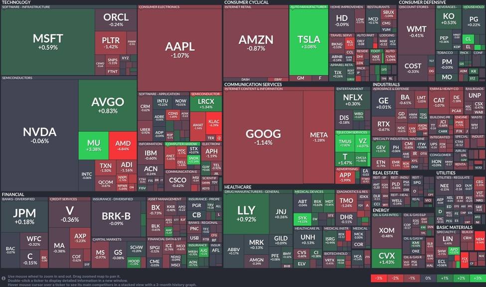 The decline in semiconductors, led by AMD’s substantial drop, may point to concerns over supply chain disruptions or competitive pressures.