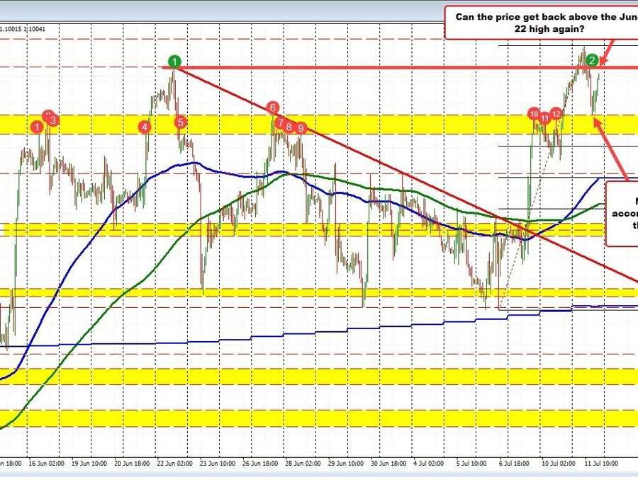 The high price going back to June 22 reached up to 1.1011. In trading earlier today (during the Asian session), the price extended above that level to a high of 1.10267. That level fell short of February 2023 high at 1.10317. Buyers turned the sellers and force the pair down to the low for the day.